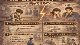 ベンチに座る時間が長い。試合に出られないまま、終了のブザー。帰り道の車内が、重い。「なんで出られないの?」 「もう辞めたい」そんな言葉を聞いたことはありませんか?今日は、 “試合に出られない時期”の親の関わり方についてです。■ まず知ってお...